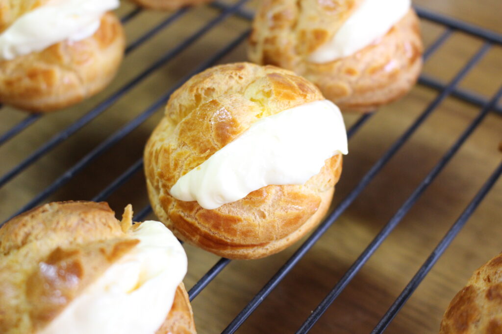 バターの香りがたまらないサクサクシュー生地にカスタードクリームと生クリームのシンプルなシュークリームです。難しそうなイメージのシュー生地ですが、基本をおさえれば失敗知らずです!